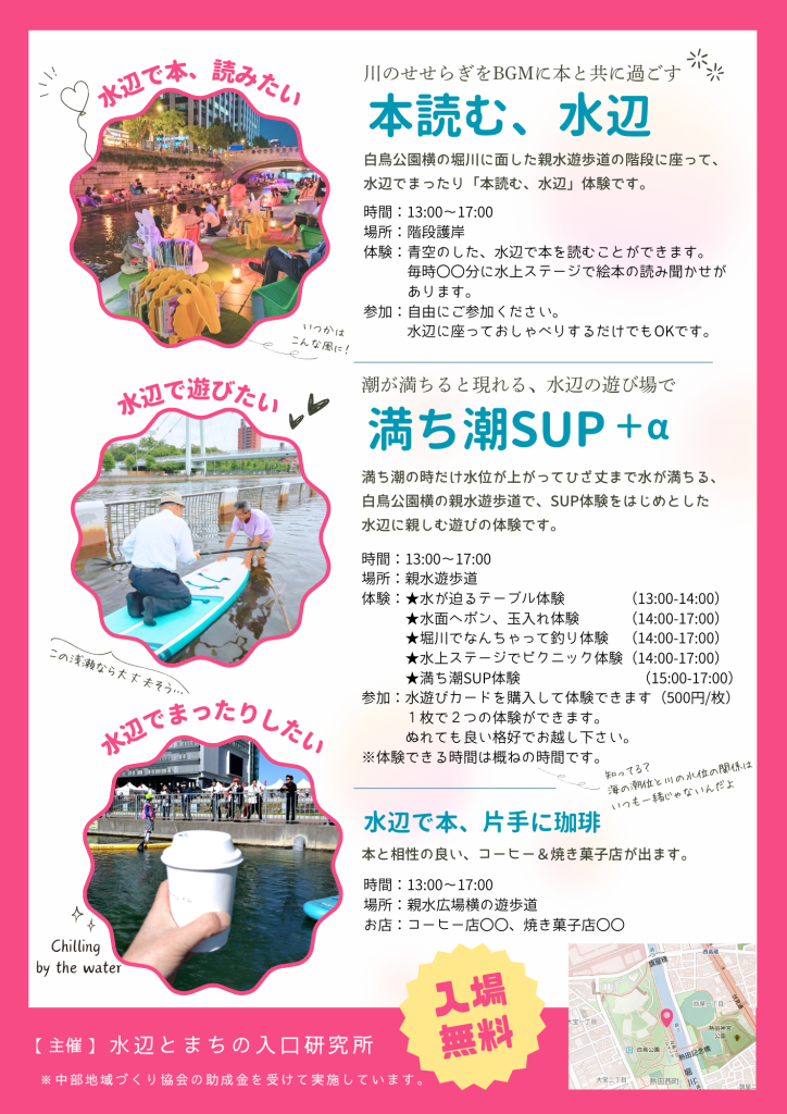 堀川の水辺で、本を片手に珈琲を飲んだり、浅瀬でちょっぴりSUP体験とか、水辺に親しんで、チルしましょう。